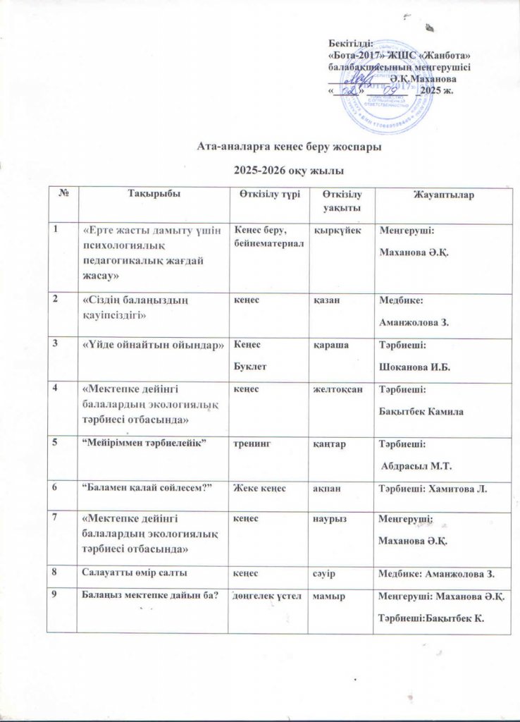 2024-2025 оқу жылына арналған "Жанбота" балабақшасы кеңес беру пунктінің жоспары
